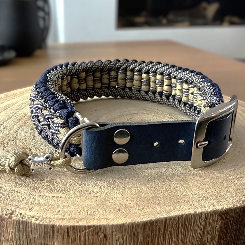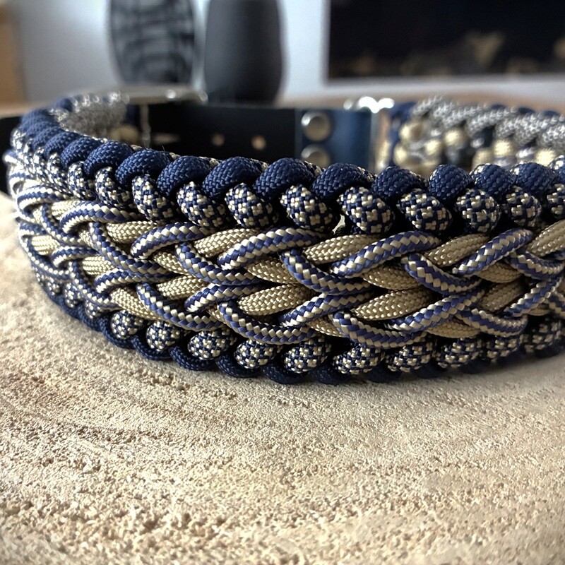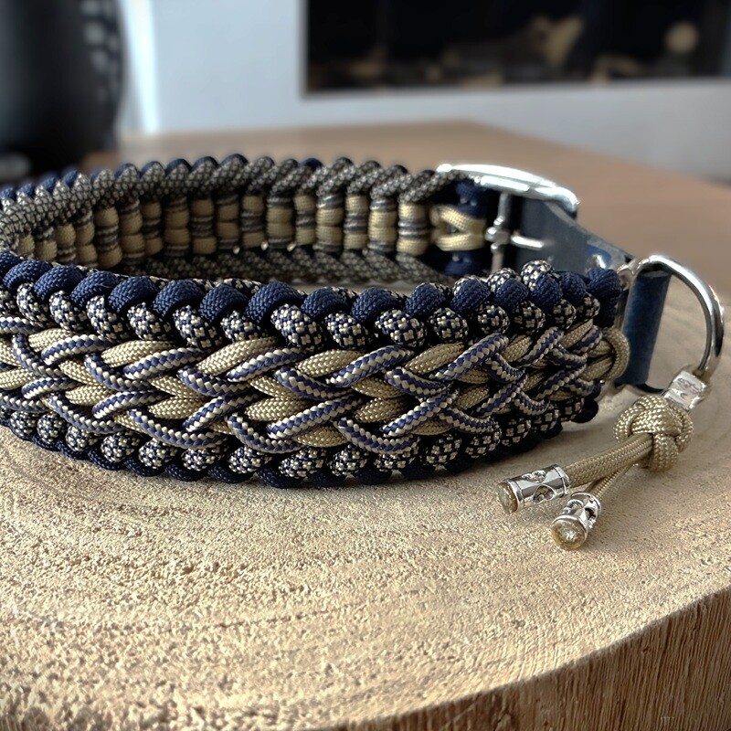 Handgemaakte Paracord halsband "Spider" in Blauw en Goud.