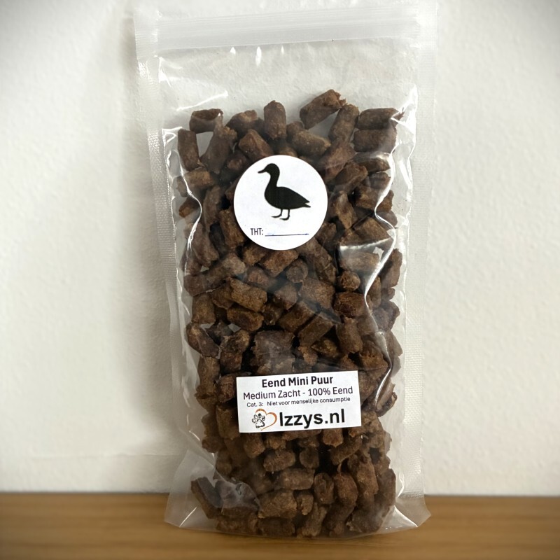 Eend Mini puur zijn medium zacht en gemaakt van 100% gedroogd vlees ( organen spiervlees en bot ) van de eend.