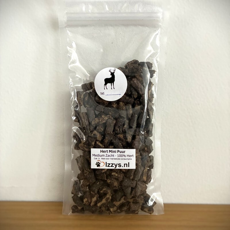 Hert Mini puur zijn medium zacht en gemaakt van 100% gedroogd vlees ( organen spiervlees en bot ) van het hert.