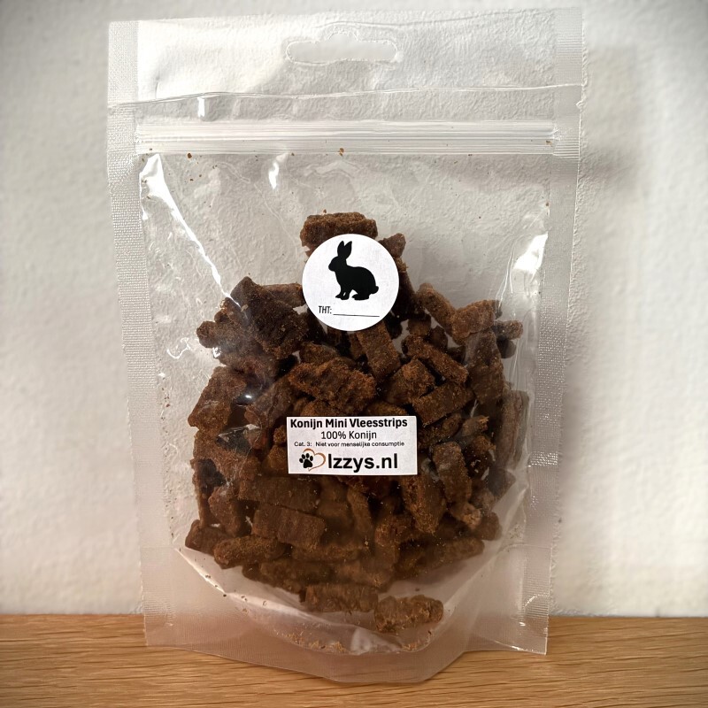 Elke 100 gram Konijn Mini Vleesstrips Trainer is gemaakt van 500 gram vers vlees.