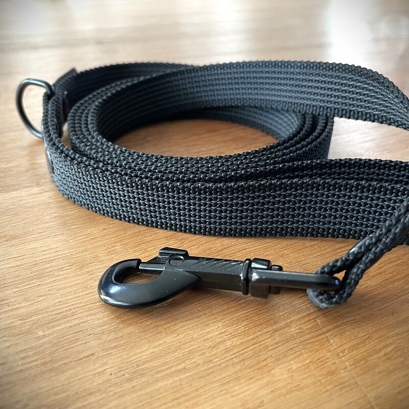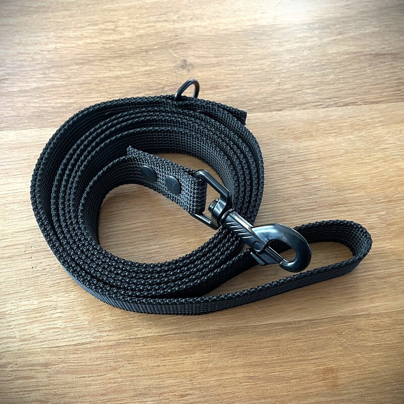 De lijn, musketon en ring zijn afgewerkt in zwart.